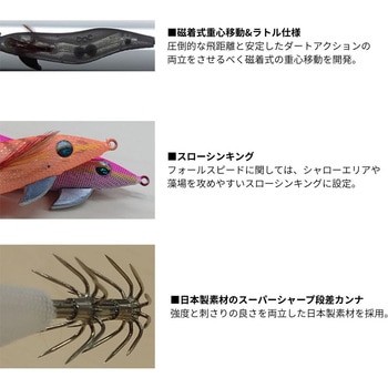 磁着式重心移動を搭載した「ぶっ飛び&安定フォール」が売りの爆釣エギ安定したフォール姿勢で定評のあるエメラルダスフォールが重心移動を搭載して新登場。ボリューム感のあるボディーにより水中のフォール姿勢が安定しスレたイカに警戒心を与えにくく、磁着式重心移動を搭載したことで飛距離が飛躍的に向上。着水しフォールに移行すれば、しっかりと磁石がウェイトを固定するので安定したフォール姿勢をキープ。いずれもラトルタイプとなっておりシャクリ時は広範囲にアピール。
