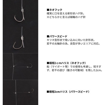 極短ハリスでアタリ明確。波止・船兼用の直結カワハギ仕掛けの登場。ハリスを絶妙の2cmに設定したことで、アタリが明確に捉えやすくなり、また誘いに対しても針がよく動く仕様の為、アピール力が高まる。シンプルで使いやすい3本直結仕掛け。船(マイボート等)での使用も考慮し、短すぎず、若干の遊び(動きの可動域)を残した2cmハリス。糸がらみが少ないDフロン船ハリス。