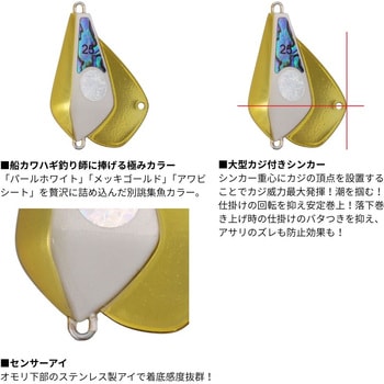 潮を掴む!大型カジ付きシンカー。船カワハギ釣り師に捧げる極みカラー。「パールホワイト」「メッキゴールド」「アワビシート」を贅沢に詰め込んだ別誂集魚カラー。潮を掴む!仕掛けの回転を抑え安定巻上!落下・巻き上げ時の仕掛けのバタつきを抑え、アサリのズレ防止効果も。センサーアイ:オモリ下部のステンレス製アイで着底感度抜群。目玉ホログラムシール:両面一対のホログラムシールでアピール力抜群。