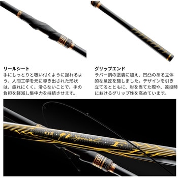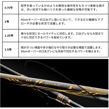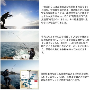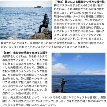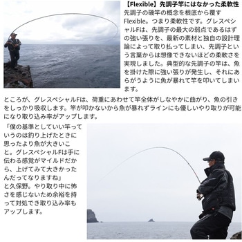 がま磯の歴史において、特にグレ釣りに求められる要素を結集した「グレスペシャル」シリーズより、新コンセプトロッドが登場。 刻々と変化する潮流の中で、釣り師にとって理想の状態は、そう長くは続きません。刹那に訪れるチャンスタイムをいかにものにできるかが、グレ釣りに於けるキーといえます。グレスペシャル Fでは、そのチャンスをものにするための重要な要素である「軽快で正確な操作性」を徹底的に追求。「Fine(繊細)・Fast(先調子)・Flexible(柔軟性)」の3つの”F”を高次元で落とし込んだ、軽量先調子に仕上げました。ロッドを構成するマテリアルの樹脂量を最適化することで、軽量なブランクを実現。1日持っても疲れ知らずで、ここ一番での集中力を欠くことなく、一連の動作をスムーズに緻密に行うことができます。また、操作性においては「沖の潮目にむかって正確無比に仕掛を投入する」「軽快なラインメンディング 」といった、磯での基本操作を素早く正確にこなせるように、先短設計・先太設計を採用。これにより、操作の正確性を損なうことなく、射程範囲を拡大することができます。そして特筆すべきは魚を掛けてからの柔軟性です。軽量先調子ロッドにありがちな特有の張りの強さや、竿タタキといったマイナス要素を払拭しました。ロッド全体がしなやかに曲がり、魚の引きをしっかりと吸収することで、純粋な引き合いが楽しめます。本来なら相反するはずの「操作性」と「柔軟性」。これらを最新の素材と独自の設計理論により両立させることで得られる「新感覚先調子」はグレ釣りの新たな境地を切り拓きます。
