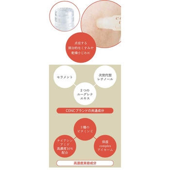 CONCブランドの共通成分である3つのキー成分(セラメント2つのユーグレナエキス次世代型レチノール)に高濃度美容成分(ナイアシンアミド高濃度10%配合3つのビタミンC保湿complexアイカーム)を配合。