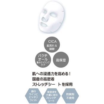 1袋にたっぷり美容成分配合、動物由来の成分を使用していないヴィーガン処方。ハリのある透明肌に導く浸透型ビタミンC誘導体配合。肌への浸透力を高める!国産の高密着ストレッチシートを採用。CICA成分& パクチオール配合、潤いで満ちる高保湿ケアの銀。自然由来の植物成分を12種配合:12種の植物成分の力を最大限に活かし、即効性を実感できるシートマスクです。CICA成分がニキビや赤み、肌荒れといった肌の悩みへ集中アプローチ。