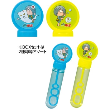 ゲゲゲの鬼太郎といっしょにシャボン玉であそぼう!ゲゲゲの鬼太郎と目玉おやじの可愛いイラストがついたシャボン玉スティックです。シャボン液入りなので開けてすぐに遊べます。軽くて持ちやすいので小さなお子さまでも遊びやすいサイズです。お外遊びやイベントの景品としてもおすすめです。大容量の24本セット。箱は什器になっているので、店頭やディスプレイにも最適!