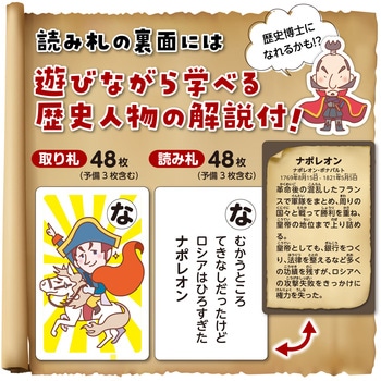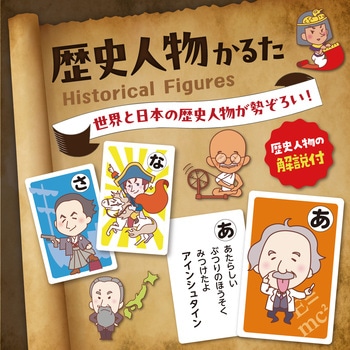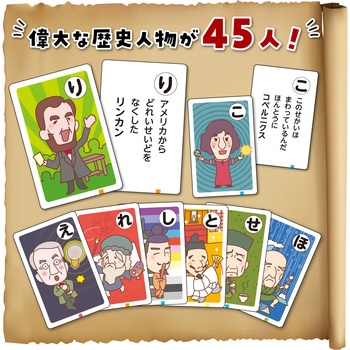 楽しく遊んで歴史博士!古今東西の偉人が勢ぞろいするかるた!有名な歴史上の人物を楽しく覚えられる知育かるたです。カードの裏面には人物の解説があり、遊びながら自然と知識が身につきます。親しみやすいイラストで小さなお子様から大人まで家族みんなで楽しめます。かるた遊びを通して歴史への興味を広げるきっかけになります。