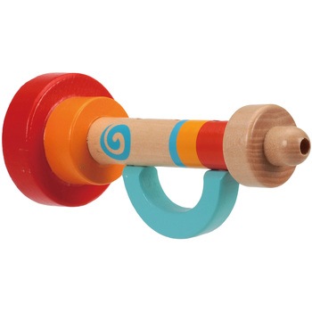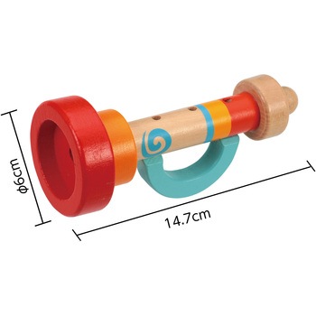 持ちやすい取っ手付き!カラフルでかわいい木製ラッパ!持ち手付きで小さな手でも握りやすいカラフルな木製ラッパです。温かみのある木の質感とポップな色合いで見た目も楽しく遊べます。吹いて音を鳴らすことで感覚遊びやリズム遊びが広がります。