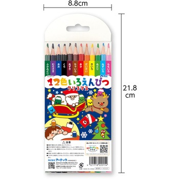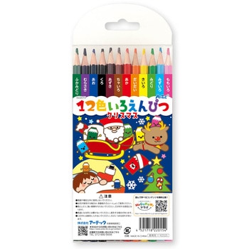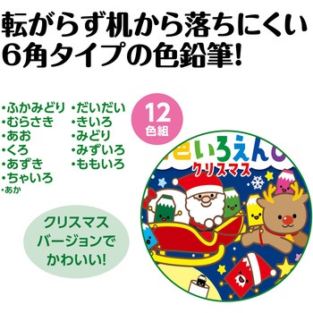かわいいクリスマスデザインの転がりにくい六角軸の色鉛筆!机の上でも転がりにくい六角軸の色えんぴつ12色セットです。サンタやトナカイがにぎやかに描かれた特別仕様のクリスマスデザインです。お絵描きや工作の時間をもっと楽しくしてくれます。クリスマスプレゼントや景品にもおすすめの商品です。