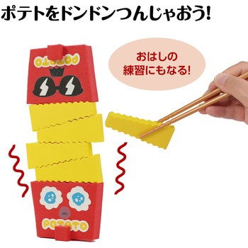 ポテトを積んでハラハラドキドキ!はし使いの練習にも!おはしでポテトを積み上げてタワーを作る、ドキドキのバランスゲームです。遊びながら自然とおはしの持ち方や指先の使い方を練習でき、手先の発達をサポートします。親子で一緒に楽しめるので幼児の初めてのおはし練習にもぴったりです。表情が選べる顔シール付きで、オリジナルの土台キャラづくりも楽しめます。