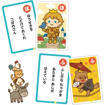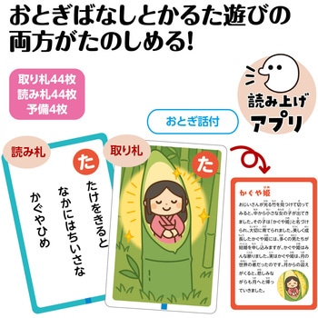 白雪姫や桃太郎が勢ぞろい!かるたで楽しむおとぎ話!おとぎ話のキャラクターが大集合した、見て楽しい・遊んで楽しいかるたセットです。赤ずきんやさるかに合戦など、全部で44のおとぎ話の世界を楽しむことができます。読み上げアプリを使うと音声が流れ、ランダム再生や残り枚数表示など便利な機能も搭載しています。家族みんなで遊ぶのはもちろん、お子さまの自主遊びにもおすすめです。