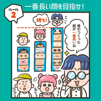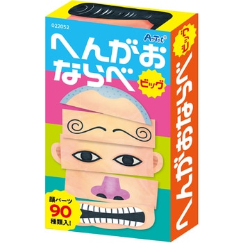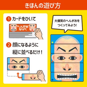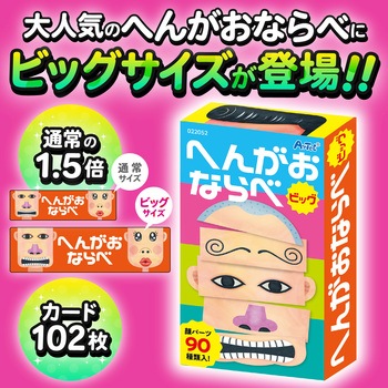 ビッグサイズが登場!ならべるだけで大爆笑!へんがおいくつつくれるかな?大人気のへんがおならべが、ビッグサイズで遊びやすくなりました。かおカードを並べて変顔をつくるカードゲームです。おもしろいイラストで、数字が読めない小さなお子様でも楽しめるゲームです。90枚のかおカードを山札から順番に引き、引いたカードで顔を作っていきます。あたまカード、おめめカード、おくちカードの3枚が揃えば顔は完成で、山札がなくなった時に一番多く顔をつくっていた人が勝ちです。