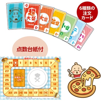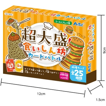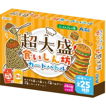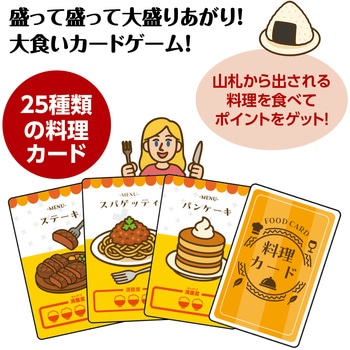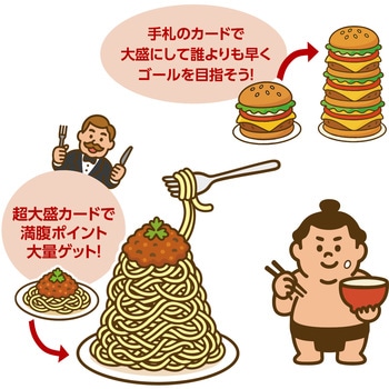 盛って、盛って、盛り上がれ!たくさん食べて満腹を目指す大食いバトル!料理カードと注文カードを使い、満腹ポイントを増減させながらゴールを目指すカードバトルです。食べれば食べるほど進む「食いしん坊レース」と食べすぎで脱落する「がまんくらべレース」の2種類のルールで遊べます。2つの遊び方で繰り返し遊べる大食いテーマの楽しいゲームです。