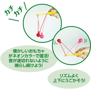 カチカチ音がクセになる、懐かしのリズムおもちゃ!シンプルな動きで夢中になれる昔ながらのリズムおもちゃです。上下にリズムよく動かしながらカチカチ音を鳴らし続けて遊べます。コツをつかむと気持ちよく音を続けられ、達成感も味わえます。ネオンカラーで見た目もにぎやかに楽しめます。