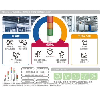 高輝度LEDを採用のΦ50mm LED積層表示灯で機械や設備の稼働状況を明確に視認できるよう設計、洗練されたデザインと安心の品質で装置の見える化をサポート、主要な認証取得済み、保証期間18か月間、NPN/PNPオープンコレクタ接続に標準対応、直付け