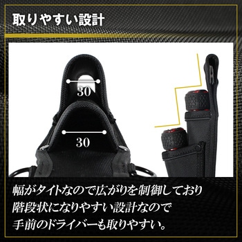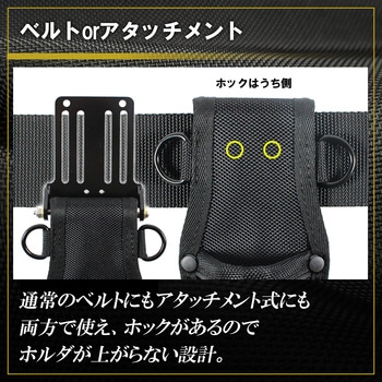 MASTER TOOLの腰道具PROシリーズ。幅がタイトなので広がりを抑制しており、階段状になりやすい設計で手前のドライバーも取りやすい。ベルトを通す部分にはホックがあり、ベルトを通す場合はホックを外すとスムーズにベルトを通すことができ、アタッチメントをつける場合はホックを止めることでホルダが上がることを止めることができる。ワンポイントのタグ文字が金色なので、男性でも女性でも扱いやすい。