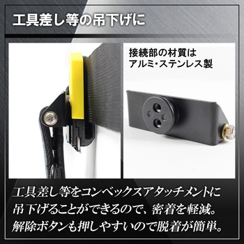 MASTER TOOLの腰道具PROシリーズのアタッチメント。接続部は円形となっているので工具差しをスイングすることができ、揺れることで更に密着軽減に。コンベックスホルダーに装着可能で、通常のフロートプレートだとデッドスペースになる部分にビットホルダーを追加することができる。脱着が多い工具差しに装着することで、コンベックスホルダが付いていたらいつでも装着することができる。穴径が5mmなら他社のビットホルダーも装着可能。接続部の材質はアルミ合金材・ステンレス材なので、摩耗にも強い。