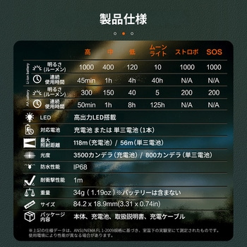 取り外し可能のカラビナ付で、簡単携帯。明るさ4段階調節可能。最大1000LM~最小15LM小型でカラビナ付きなので、いつものバッグにつけておいても安心。カラビナはマグネットで取り付けている為、着脱可能。外した後はテールマグネットとして利用できます。充電の際は、ライトを緩めるとリチウム電池の取り外しが可能。充電池に直接CタイプUSBを差込み、充電中は赤ランプ、満充電で緑ランプが点灯します。