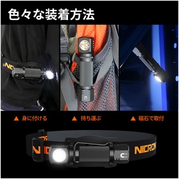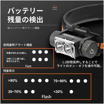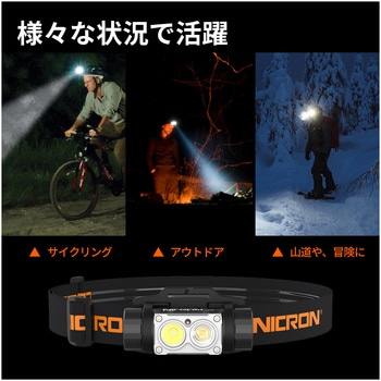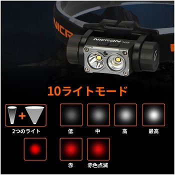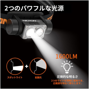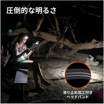 2つのスイッチで、ワイド・スポットライトが可能明るさ4段階調整可能。スポット、ワイド同時点灯で最大1600LMスイッチが2つあり、簡単にスポット/ワイドの光軸変更が可能。赤色灯モード搭載。ライト部分は180度可変式。高弾性ヘッドバンドで滑りにくい加工。