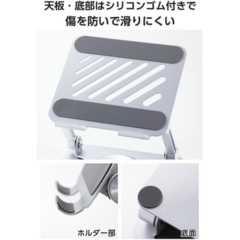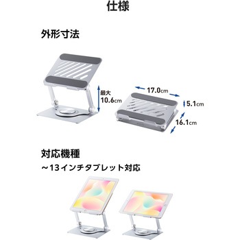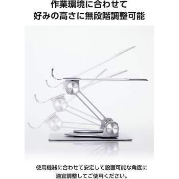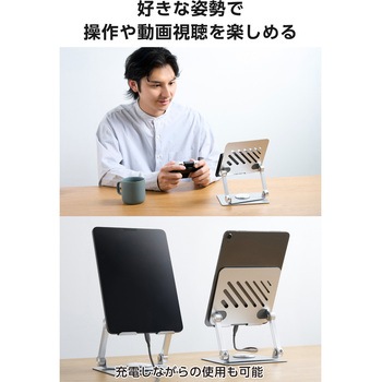 お好みの高さや角度に加え、左右への向きも自由に変えられる折り畳み式タブレットスタンドです。動画視聴やオンライン会議、資料閲覧など幅広いシーンに合わせて活躍します。