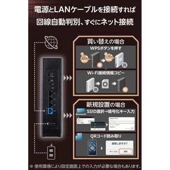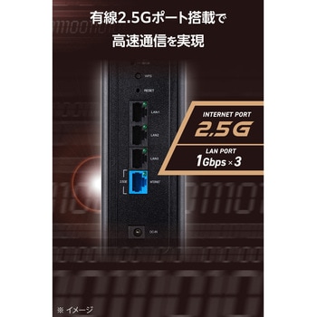 特記IPv4ルーターモード(IPアドレス自動取得、IPアドレス手動設定、PPPoE)、IPv4 over IPv6(IPIP)の場合は利用可能です。※IPv4 over IPv6サービス利用時はご利用いただけません。備考【対応IPv6 IPoEサービス】v6プラス、IPv6オプション、OCNバーチャルコネクト、transix、クロスパス、v6 コネクト規格【有線】IEEE 802.3bz(2.5GBASE-T)、IEEE 802.3ab(1000BASE-T)、IEEE 802.3u(100BASE-TX)、IEEE 802.3(10BASE-T)準拠対応OS【Android】Android 16/15/14/13/12/11/10【Windows】Windows 11/10【iOS】iOS 26/18/17/16/15【iPadOS】iPadOS 26/18/17/16/15【macOS】macOS Tahoe 26/macOS Sequoia 15/macOS Sonoma 14/macOS Ventura 13/macOS Monterey 12/macOS Big Sur 11入力電圧(V)AC100±10% 50/60Hz適合機器【無線LAN】iPhoneシリーズ、iPadシリーズ、Android端末、各種ゲーム機(ニンテンドー3DSシリーズ、PlayStation(R)Vitaシリーズ、PlayStation(R) 5/4、NINTENDO SWITCH(TM)、NINTENDO SWITCH(TM) 2)、各種無線LAN搭載機器設定方式WPS対応対応【MU-MIMO機能】〇(※接続機器もMU-MIMOに対応している必要があります)【ハードウェアNAT】〇【マルチSSID】〇(2.4GHz)【自動ファームウェア更新】〇【SSIDセパレーター】〇【ビームフォーミングZ】〇 ※接続機器もビームフォーミングに対応している必要があります。周波数2.4GHz帯機能こどもネットタイマー3対応、SPI、DoS攻撃防御、インターネット側からの設定拒否/Ping応答拒否、DMZ対応、UPnP(※1)、MTU設定、NTPクライアント、IPsecパススルー(※2)、PPTPパススルー(※2)、回線自動判定機能、アクセスコントロール対応(最大20エントリー)、IPv6ブリッジ対応、ALS機能コネクタ【有線】WANモード【動作モード】ルーター/AP(アクセスポイント)/中継器【離れ家モード】通常/離れ家アンテナ内蔵アンテナ:5GHzセキュリティWPA2 Personal(AES)、WPA3 Personal(AES)、WPA2/WPA3 Personal(AES)通信速度IEEE 802.11ac / IEEE 802.11ax / IEEE 802.11be / IEEE 802.11g無線IEEE 802.11be、IEEE 802.11ax、IEEE 802.11ac、IEEE 802.11n、IEEE 802.11g、IEEE 802.11b、IEEE 802.11a準拠無線通信方式IEEE 802.11be伝送速度有線:【LAN】1000Mbps、100Mbps、10Mbps【WAN】2.5Gbps、1000Mbps、100MbpsUSBポートなし接続台数推奨 40台アクセス方式インフラストラクチャー無線規格EasyMesh(※)、セキュリティWi-Fi、友だちWi-Fi、SSIDステルス設定、自動チャンネル設定(オートチャンネル)、送信出力制限、WPS、バンドステアリング、MLO(2.4GHz、5GHz)(※)、Multi-RU、Preamble Puncturing、TWT ※離れ家モード有効時はご利用いただけません。対応ブラウザ【セットアップツール】Microsoft Edge、 Google Chrome 、Safari ※標準搭載のWebブラウザーを使った初期設定(インターネット接続設定)のみ対応しています。対応プロトコルTCP/IP(IPv6、IPv4)チャンネルタイプ2.4GHz帯内容量1個