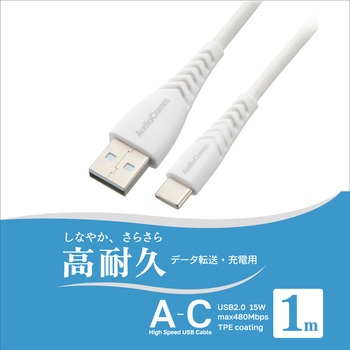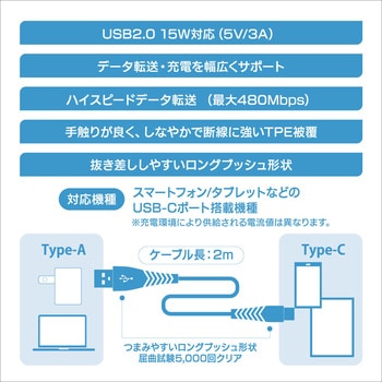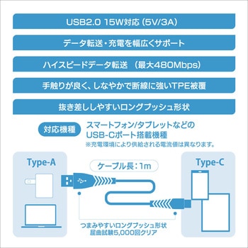 USB Type-A と USB Type-C を接続できる高耐久USBケーブルです。最大15W(5V/3A)の急速充電と最大480Mbpsのデータ転送に対応し、スマートフォンやタブレットの充電やデータ移行を快適に行えます。断線に強いTPE被覆を採用し、毎日の使用に適した耐久性を備えています。ロングブッシュ形状で抜き差ししやすく、扱いやすい設計です。