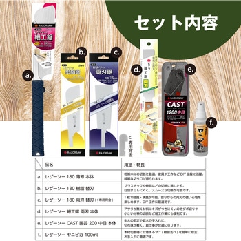 初めてDIYされる方や園芸作業をされる方に最適な鋸をセット。a.レザーソー180薄手:乾燥木材の切断に最適。家具やDIY全般に。b.レザーソー180樹脂:プラスチックや樹脂の切断にc.レザーソー両刃:縦引き横引きができる昔ながらの鋸形状d.レザーソー細工鋸:材料に傷がつきにくいのでダボ切や細工作業に便利e.レザーソーCAST園芸中目:生木の剪定や庭木の手入れにf.レザーソーヤニピカ:木材切断時に付着するヤニが簡単に除去できます。