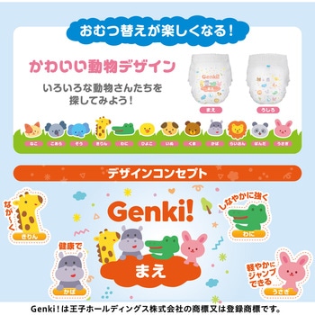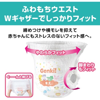 国内自社工場で生産したパンツタイプのベビー用紙おむつです。シルキーエンボス製法により不織布の表面の盛り上がりを大きくすることで、ふわふわ・もちもちのやわらかい肌触りを実現しました。全面通気シートを採用することで、ムレを防ぎ、赤ちゃんの肌への負担を軽減します。スピード吸収でしっかり吸収し、逆戻りしにくくなっています。最長12時間吸収です(※おむつの吸収量の目安です。赤ちゃんのおしっこの量には個人差があります)。ふわもちウェストは締めつけすぎず、やわらかフィットです。脚まわりは内側のWギャザーでぴったりフィットし、横漏れを抑えます。おむつ替えが楽しくなる、かわいらしい動物デザインです。ラインの色の変化で替え時が一目でわかる、おしっこお知らせサイン付きです。