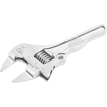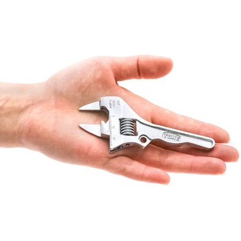 ガタつきが少なく、なめにくいショートハイパーウォームモンキレンチです。2分割されたハイパーウォームが下アゴのラックをはさむ構造になっており、すき間を無くしガタつきが少なくなりました。ねじ山が最大6個噛み合うことでラックを確実に保持します。先端の厚みが2mmの薄形仕様になり、薄形ナットに対しても使用可能です。カラビナなどを引っ掛ける穴もあり、持ち運びに最適です。手のひらサイズで持ち運びやすいです。目盛付きです。