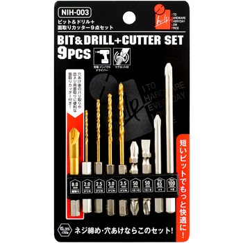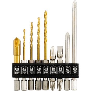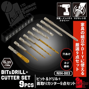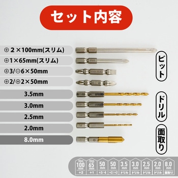 DIYなどによく使われるビットとドリルを厳選してまとめた便利な8点+面取りカッターのセットです。DIY作業、家具組立などこれ一つあればOK!先端に磁力を帯びており、小さなねじもどこかへ飛んで行く心配がありません。長めビットは狭い隙間などの作業に役立ちます。面取りカッターは、穴あけ後のバリ取りや皿ネジ用面取りに便利です。
