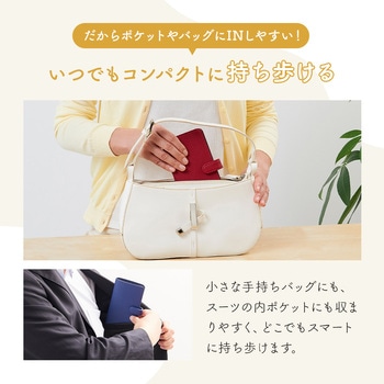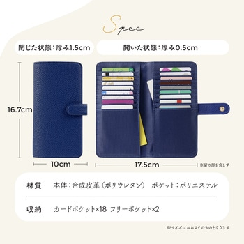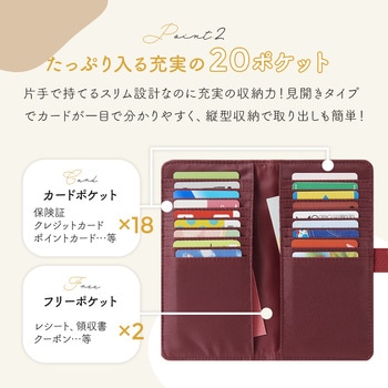 片手で持ちやすいスマホサイズのカードケースです。コンパクトだからかばんの中でかさばりにくい。見やすい見開きタイプで、カードを18枚収納できます。レシートやクーポンなどを入れておけるフリーポケット2室付。