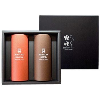 丸叶むらたのギフト【香茶葉-kouchayou-GIFT 2P KOUCHA / HOUJICHA】茶葉からできる紅茶・ほうじ茶の香りのお線香セットです。お仏壇にそのまま置ける筒型タイプのパッケージです。・煙の量:少ない・燃焼時間:約30分