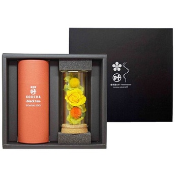 丸叶むらたのギフト【香茶葉flower KOUCHA GIFT】茶葉からできる紅茶の香りのお線香とボトルフラワーのギフトです。プリザーブドフラワーなのでキレイに長持ちします。・煙の量:少ない・燃焼時間:約30分