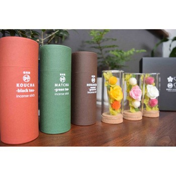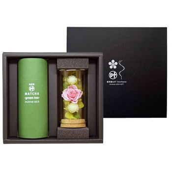 丸叶むらたのギフト【香茶葉flower MATCHA GIFT】茶葉からできる抹茶の香りのお線香とボトルフラワーのギフトです。プリザーブドフラワーなのでキレイに長持ちします。・煙の量:少ない・燃焼時間:約30分