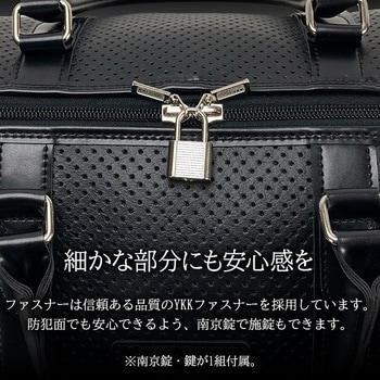 片側面:ファスナーポケット / 背面:オープンポケット / 本体内部:オープンポケット / 底鋲 / 肩アテ付きショルダーベルト / 南京錠 / YKKファスナー