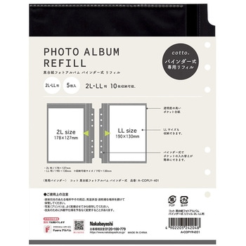 コットシリーズ 黒台紙フォトアルバム バインダー式の替台紙です。リフィルを組み合わせれば、L判、KG判、2L判(LL判)の写真を1冊にまとめられます。台紙は透明度の高いフィルムを使用。写真が映える黒台紙です。