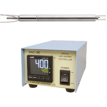 スーパーエアヒーターMAXとデジタル温度調節器のセット品でごす。スーパーエアヒーターMAXは、小型で狭所作業に適し、超低流量でも高温が出せるため鉛フリーハンダに最適です。極小面加熱源として利用でき、ハンダゴテに代わる非接触ツールとして使用できます。ハンダ付ロボットのハンドにも使用可能です。先端センサー内蔵により吹出口の温度を正確に管理でき、安定した加熱品質を実現します。DAC-8Eに接続するだけで簡単に温度設定でき、装置組み込みにも便利です。