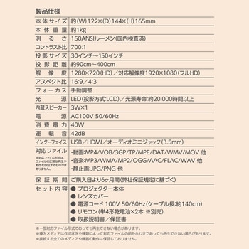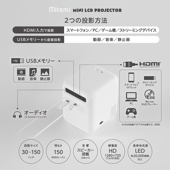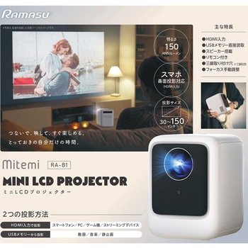 【ミニLCDプロジェクター RA-B1のおすすめポイント】HDMI入力で投影(スマホ/PC/ゲーム機/ストリーミングデバイス等に対応)USBメモリーで直接投影(動画/音楽/静止画ファイル対応)明るさ150ANSIルーメン)30~150インチ大画面投影フォーカス手動調整(微調整がしやすい手動タイプ)スピーカー搭載リモコン付き三脚取り付け穴付き(三脚は別売りとなります)