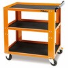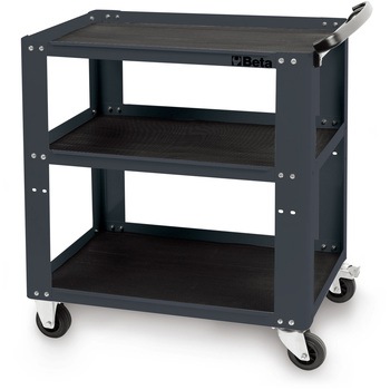 3つの天板は滑り止めの為のゴム付です。人間工学に基づいたハンドルです。中央の作業台は2つの高さが選べます。4つのキャスターΦ100 mm:固定2つ、ステアリング2つ (1つはブレーキ付き)。