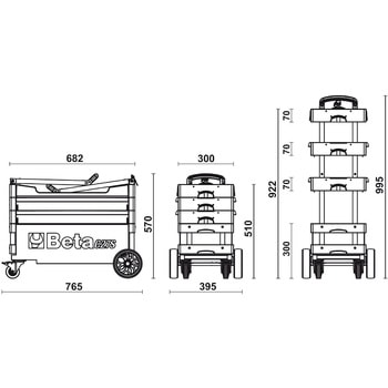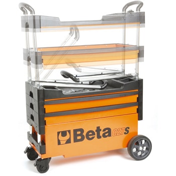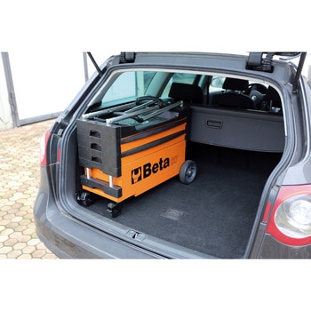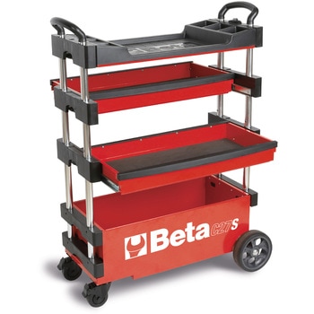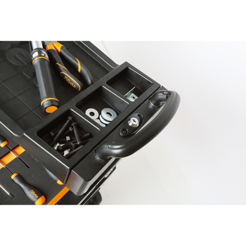 車載等での持ち運びに便利な折りたたみ式のツールトロリーです。2、3段目のスライドトレー(引出し)は前後どちらにでも引き出せます。ボールベアリング付のレールにより、スライドがスムーズです。天板のトレーには6つの小物入れが備えられており、パーツの整理などに便利です。