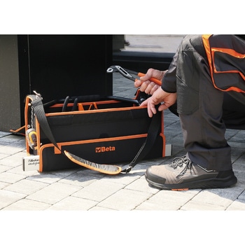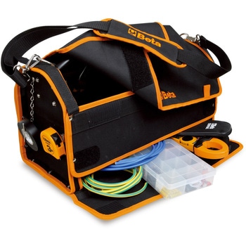 ハードフレームです。二重底になっており、底部は取り外し可能でバッグの容量を増やすことができます。傾斜ハンドルで工具の出し入れが簡単です。伸縮性のあるツールバンドと内外ポケット付きです。取り外し可能なカバーが付いています。二重底にツールトレイ付きです。