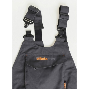 BETA EASYシリーズは非常に軽量に出来ており重さを感じさせない作りで作業者の負担を減らします。軽さに重点を置きつつ、使い勝手や耐久性にも配慮された作りとなっています。胸元には小型のツールを収納可能な大き目のポケット、両もも上には2つずつポケット(内1つはマジックテープ付き)、左ひざ部にはマジックテープ付きポケットが2つ、お尻部分にもマジックテープ付きのポケットが2つ付いており大容量に対応したサロペットです。腰回りには左サイドにラチェットなどやや長めのツールも収納可能な深さの有るアコーディオンポケットが付いています。ひざ部には地面と接触する事を考慮し、厚めのポリエステル生地を使用したニーパッド用ポケットが備わっています(膝が痛い場合は、このポケットに厚手の布地やスポンジ等を入れる事で、痛みが軽減できます)。各部とも、プロ~アマを問わず、機能性を重視しつつも動きやすさも考えられたサロペットとなっています。
