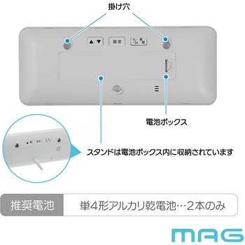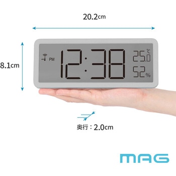インテリアにマッチする細目フォントで無駄のないシンプルなデジタル電波時計です。温度・湿度・電波受信マーク付き。背面には掛け穴付きでシーンに併せて置き掛け両用でお使いいただけます。