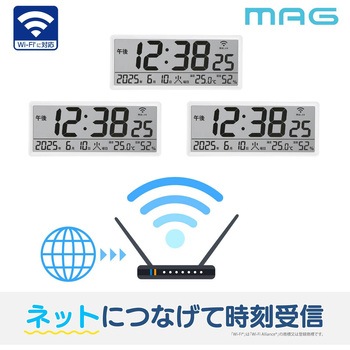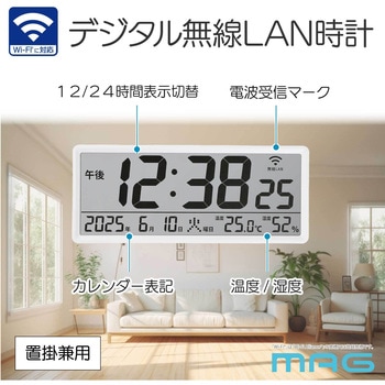 電波時計の電波が届きにくいお部屋にオススメのネットに繋げて時刻を同期できる無線LAN時計です。広いお部屋でも視認性の高い大型サイズで置き掛け兼用でご使用いただけます。NTPサーバー接続先を任意選択可能のため、企業様の設備品としても利用できます。時刻表示、カレンダー表示、温度/湿度表示、12/25時間表示切替、電池交換お知らせ表示、タイムゾーン(時差)設定ができる多機能仕様です。※必ずアルカリ乾電池をご使用ください