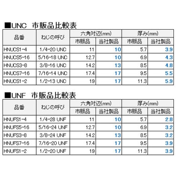 薄く、コンパクトに切削したステンレス製の六角ユニファイナットです。UNC(並目)、UNF(細目)の2種類ラインナップございます。市販品よりも30%~最大65%程度薄く仕上げており省スペースでご使用いただけます。六角対辺はインチ規格ではなく一般的なミリ用のスパナを使用できます。緩み止め防止にダブルナットでのご使用も有効です。