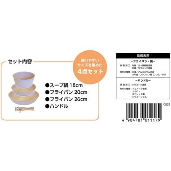 用途食材を炒めたり焼いたり(フライパン)、スープ、ポタージュ、シチュー、カレー、みそ汁などを調理する際に(スープ鍋)仕様食洗機使用可(ハンドル除く)セット内容スープ鍋18cm/フライパン20cm/フライパン26cm/ハンドル材質ハンドル:フェノール樹脂、ナイロン、ステンレス鋼、シリコーンゴム / フライパン・鍋(本体):アルミニウム合金 / フライパン・鍋(はり底):ステンレス鋼(クロム16%)色ベージュ質量(g)【スープ鍋18cm】414、【フライパン20cm】350、【フライパン26cm】568【ハンドル】208表面処理【フライパン・鍋】(内面)フッ素樹脂塗装 / (外面)セラミック塗装【ハンドル】シリコーン塗装対応電磁調理器(IH)/ガスコンロ寸法(奥行D×幅W×高さH)(mm)【ハンドル】185×40×46底面の厚さ(mm)2.4(はり底含む)満水容量(L)【スープ鍋18cm】2内形寸法(奥行D×幅W×高さH)(mm)【スープ鍋18cm】180×180×86、【フライパン20cm】200×200×47、【フライパン26cm】260×260×59内容量1個