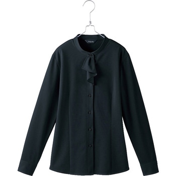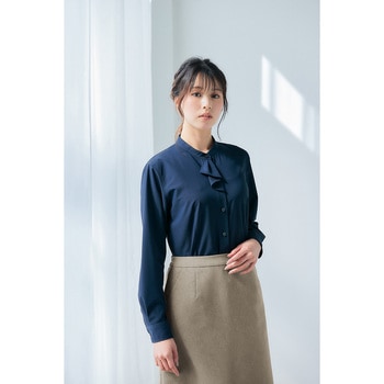 フリル付きで華やかな印象の、濃色カラーの長袖スタンドカラーフリルブラウス