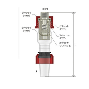 異常圧力による事故を未然に防止する圧力逃し弁です。装置内の圧力が設定圧に近づくと、スプリングの荷重より弁体を押し上げる力の方が大きくなり、内部の圧力を逃がします。装置内の圧力が設定圧以下まで下がると、再び弁体が閉じ、装置を適正圧力で維持することができます。設定圧は、スペーサーとスプリングによって定めています。出荷時に設定圧は調整していますが、Oリング等の劣化によりリリーフ圧力(設定圧)は変動する場合があります。