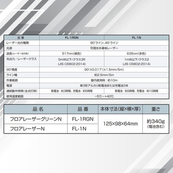 用途床や壁の墨出しに90°と45°のラインが簡単にわかる。付属品収納ケース・単3形アルカリ乾電池3本・シフティングベース質量(g)340(電池含む)種類レーザー光:90°ライン・45°ライン使用温度範囲(℃)(-)5~40電源単3形アルカリ乾電池または充電池3本精度90°±0.017°(±1.5mm/5m)連続使用時間(時間)乾電池:約9、充電池:約10※全点灯時光源可視光半導体レーザー波長(nm)635ライン幅(5m地点)2.5レーザークラスクラス3R(JIS C6802:2014)サイズ(mm)125×64×98作業範囲(m)屋内使用時:約10光出力(mW)1以下レーザー光色赤色内容量1セット