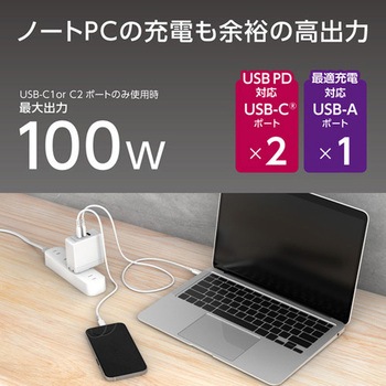 ノートPC1台とスマートフォン2台、合計3台同時充電対応。