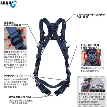 装着ストレスZERO:Free Joint機構により、屈伸作業などにツッパリ感を感じません。しなやかなシートベルト調の採用により、装着性が向上。ベルトの緩みZERO:固定機能付ベルト通しの採用により、継続使用時におけるベルトの緩みを軽減。余長止め具を採用し、作業時におけるベルトの垂れ下がりを防止。無駄スペースZERO:別売のマルチツールホルダーを使用することで腰回りのスペースを利用。別売の胴ベルトが装着可能です。