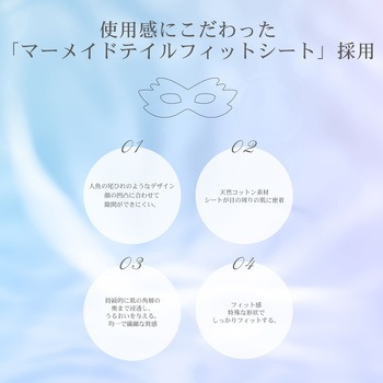 天然コットンシートが目の周りの肌に密着、人魚の尾ひれのようなデザインは顔の凹凸にあわせてすき間ができにくく肌にフィット。有効成分が角質の奥まで浸透しハリのある目元をつくります。