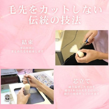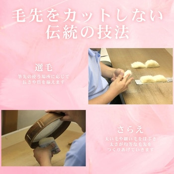 いつものメイクにちょっとプラスで素敵な自分を演出。職人の手により伝統的な技法で製造された「熊野筆」のパウダー・チーク・アイシャドーの基本ブラシ3本をセットにしました。自宅で使用するのも持ち運びにも便利なコンパクトな長さです。山羊の【白尖峰(ハクセンポウ)】を使用。程よくコシがあるバランスの良い毛質です。動物毛の持つキューティクルが粉含みを良くし、肌に乗る感触も優しい1本です。